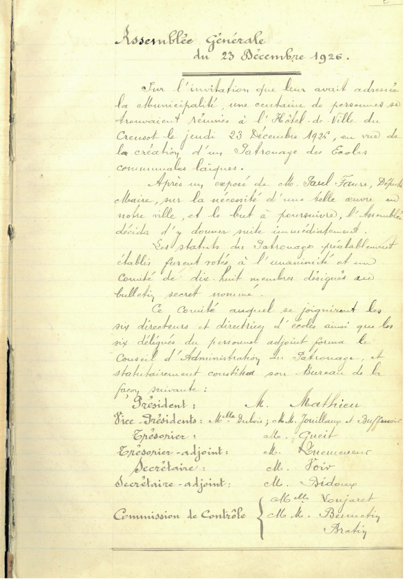 Notre association fête ses 100 ans cette année. Pour l'occasion, nous souhaitons partager avec vous un souvenir par mois. Ce mois-ci, nous vous présentons un document d'archives : le compte-rendu de la toute première assemblée générale datant du 23 décembre 1926 !