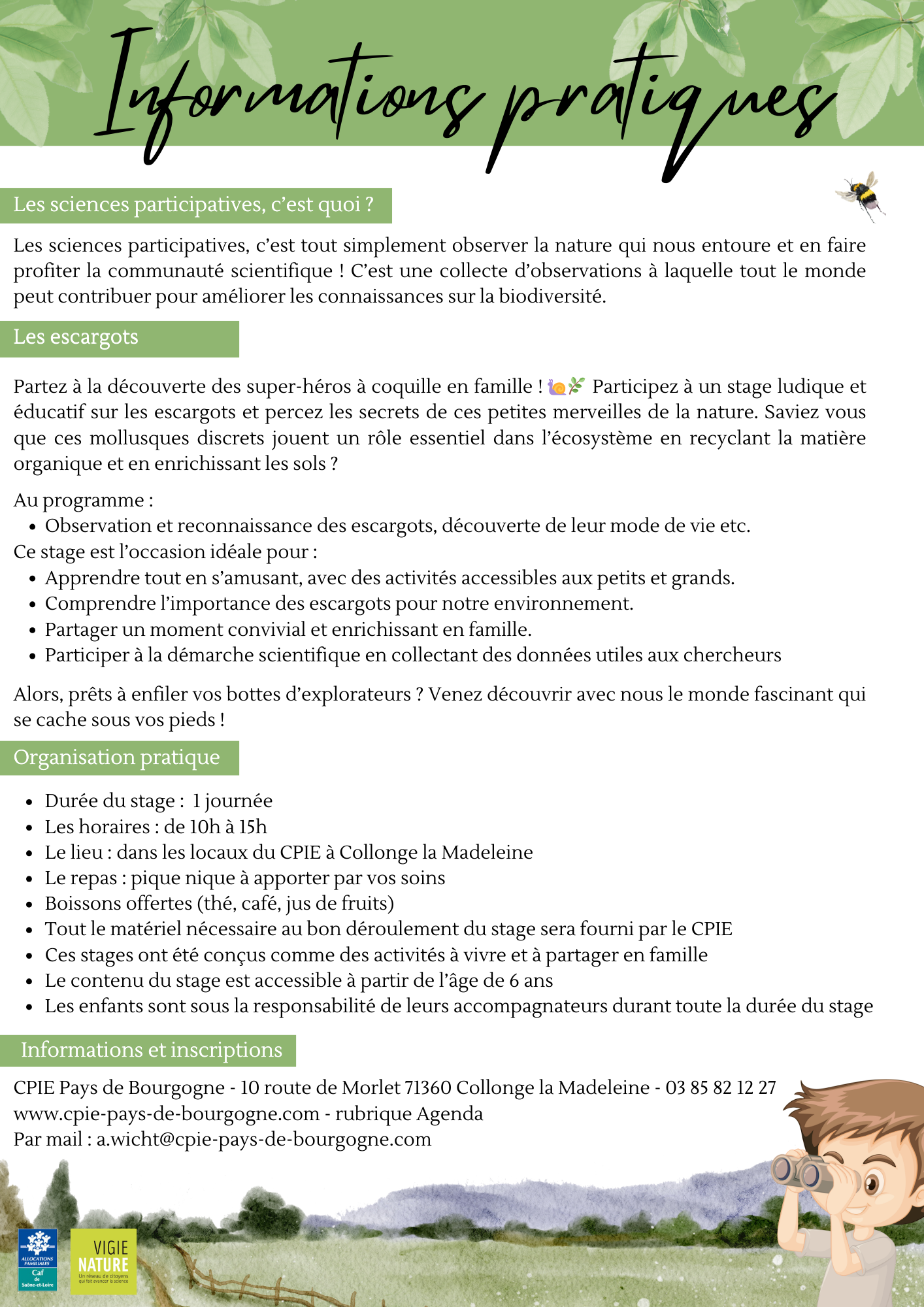 Participez à une journée ludique et éducative sur les escargots, et percez les secrets de ces petites merveilles de la nature. Saviez vous que ces mollusques discrets jouent un rôle essentiel dans l’écosystème en recyclant la matière organique et en enrichissant les sols ? Profitez d’un stage gratuit et en famille ! Inscription avant le 6 avril.
